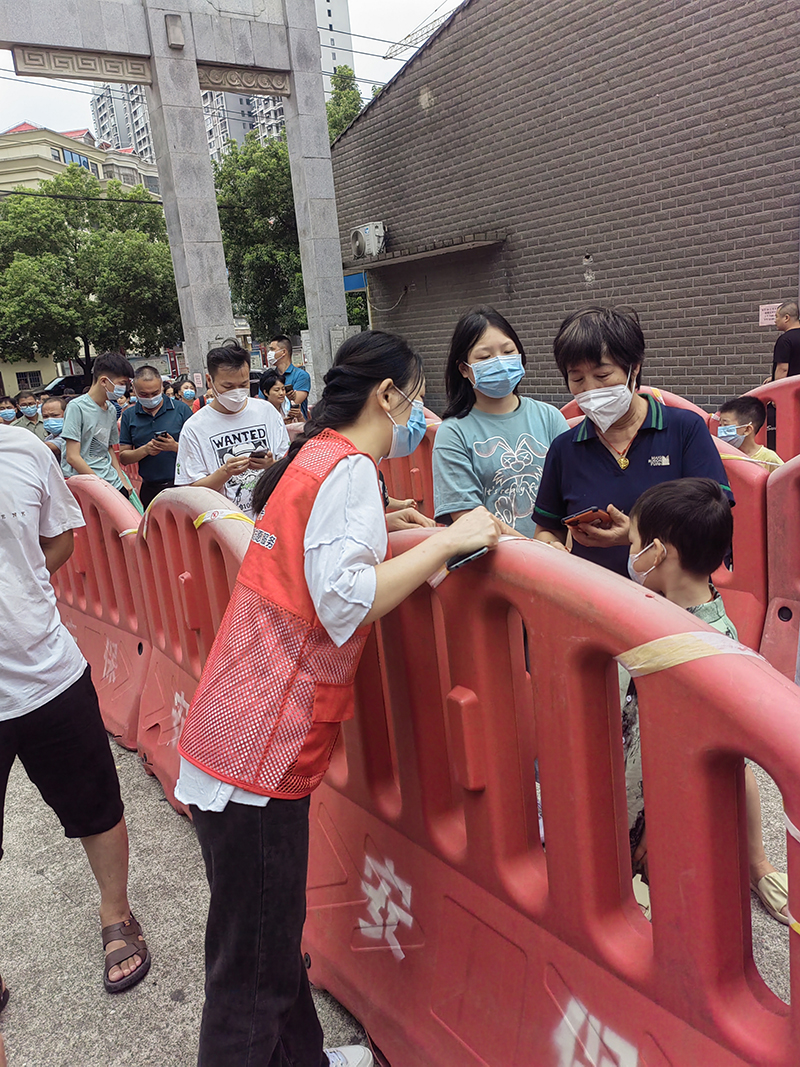 在核酸檢測(cè)現(xiàn)場(chǎng),志愿者們與工作人員一同引導(dǎo)居民們按順序依次進(jìn)行核酸檢測(cè),認(rèn)真核對(duì)好檢測(cè)人員的身份信息并進(jìn)行錄入,做到規(guī)范、科學(xué)、快速有序開展登記和檢測(cè)工作,做好檢測(cè)人員的銜接,最大限度提高檢測(cè)工作效率,確保全民檢測(cè)工作有序開展。