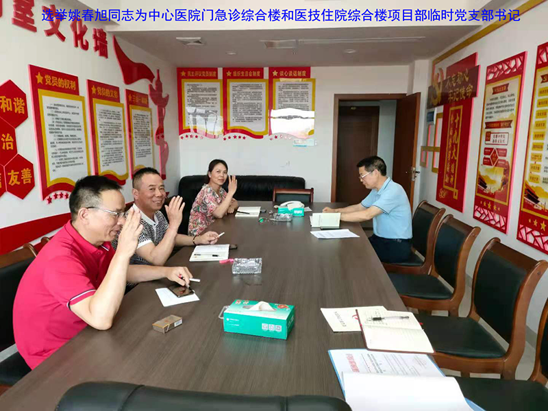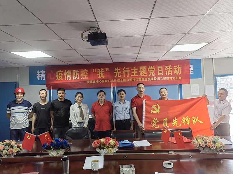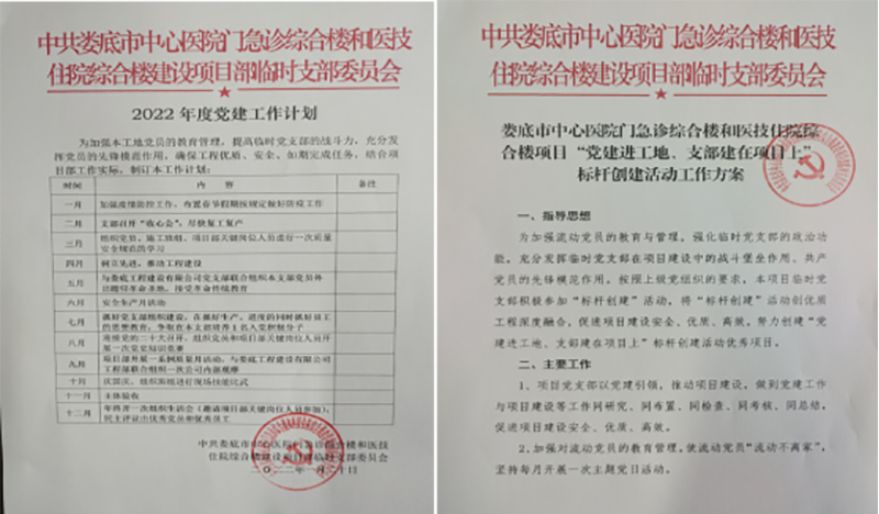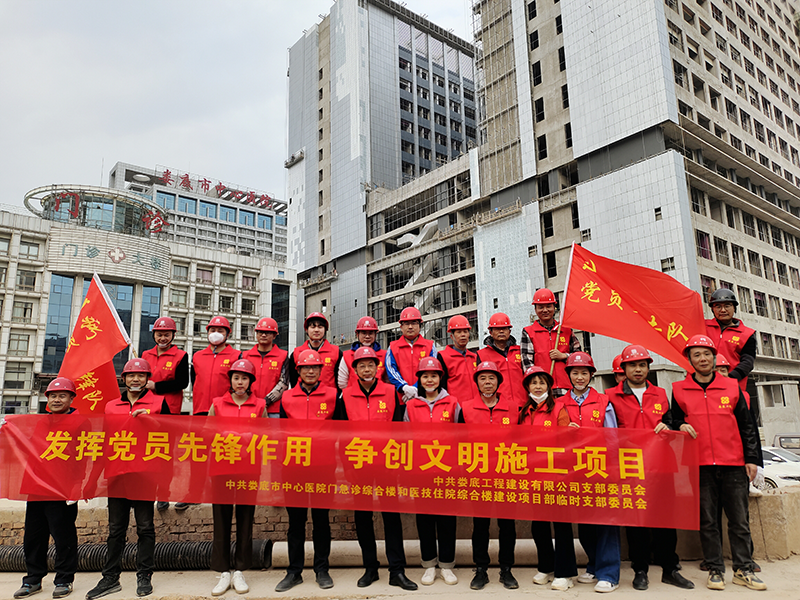 該項目地處婁底市最繁華街道的十字路口,又是婁底市最大的單體建筑公共項目。項目中標后,公司立即配備優(yōu)秀骨干組建項目部班子,并成立了中共婁底市中心醫(yī)院門急診綜合樓和醫(yī)技住院綜合樓建設(shè)項目部臨時支部委員會,推舉項目經(jīng)理姚春旭擔(dān)任臨時黨支部書記,并安排了黨建指導(dǎo)員。該支部目前有黨員8人。項目部設(shè)置了黨員活動室,文化走廊等,臨時黨支部“五化”建設(shè)達標。