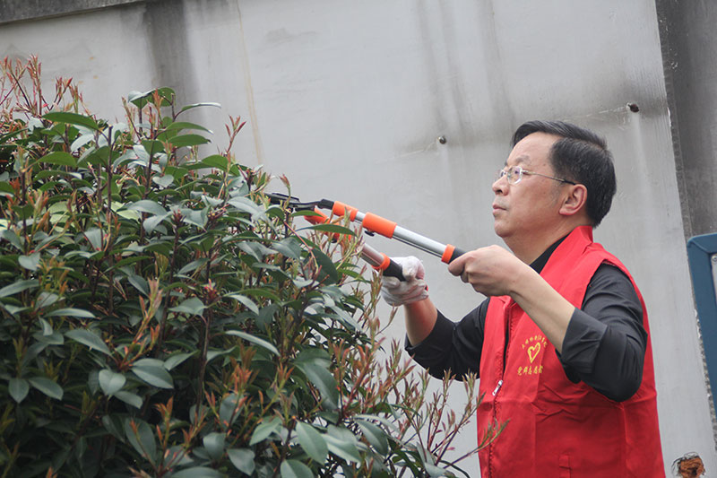 活動現(xiàn)場,志愿者們身穿紅馬甲化身“保潔”清潔公路、撿綠化帶里的垃圾;化身“園林技師”修剪綠植、施肥、澆水。