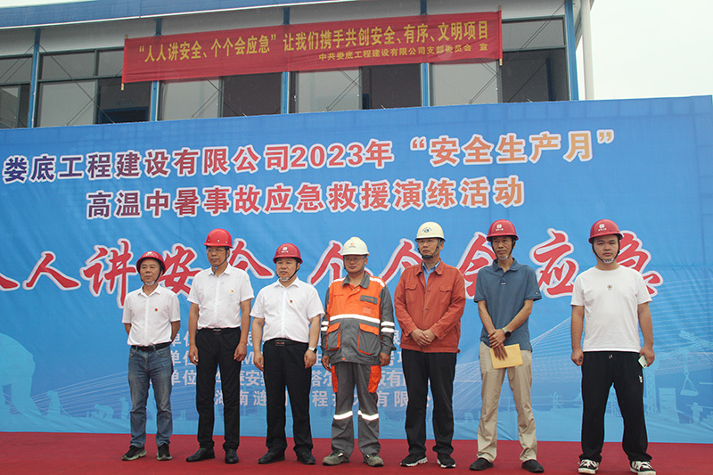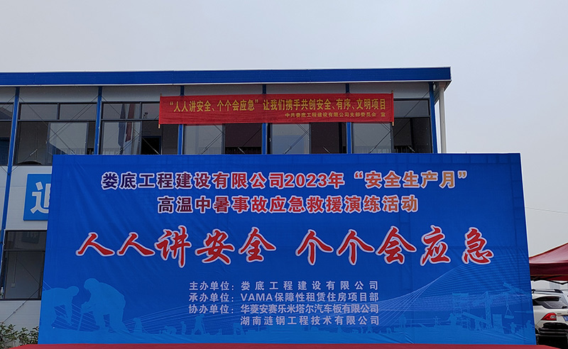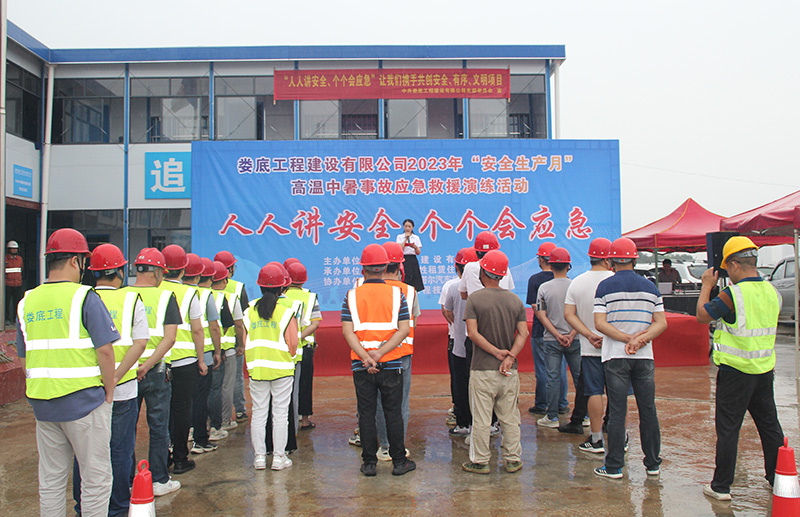 為響應(yīng)省、市2023年“安全生產(chǎn)月”活動有關(guān)文件要求,圍繞“人人講安全  個個會應(yīng)急”的主題進(jìn)一步提高公司安全管理水平,規(guī)范公司安全生產(chǎn)過程的管理工作,本著"安全第一、預(yù)防為主、綜合治理"的安全管理方針,在發(fā)生高溫中暑事故時,能夠迅速有效進(jìn)行搶救,通過高效率的組織體系應(yīng)對突發(fā)事件,以最短時間、 最有效的方法控制和減少人員財產(chǎn)損失,減少人身傷害事故。公司于2023年6月13日上午10時在VAMA保障性租賃住房項目部開展高溫中暑事故應(yīng)急救援演練活動。婁底市經(jīng)開區(qū)住房和城鄉(xiāng)建設(shè)局領(lǐng)導(dǎo)李愛民先生、康城先生,建設(shè)單位代表藍(lán)斌先先,監(jiān)理單位代表劉少勇先生,公司總經(jīng)理胡勁、黨支部書記何林、副總經(jīng)理彭洪偉出席了次此活動,公司各部室及婁底城區(qū)中心項目部近40余人參加了此次活動。